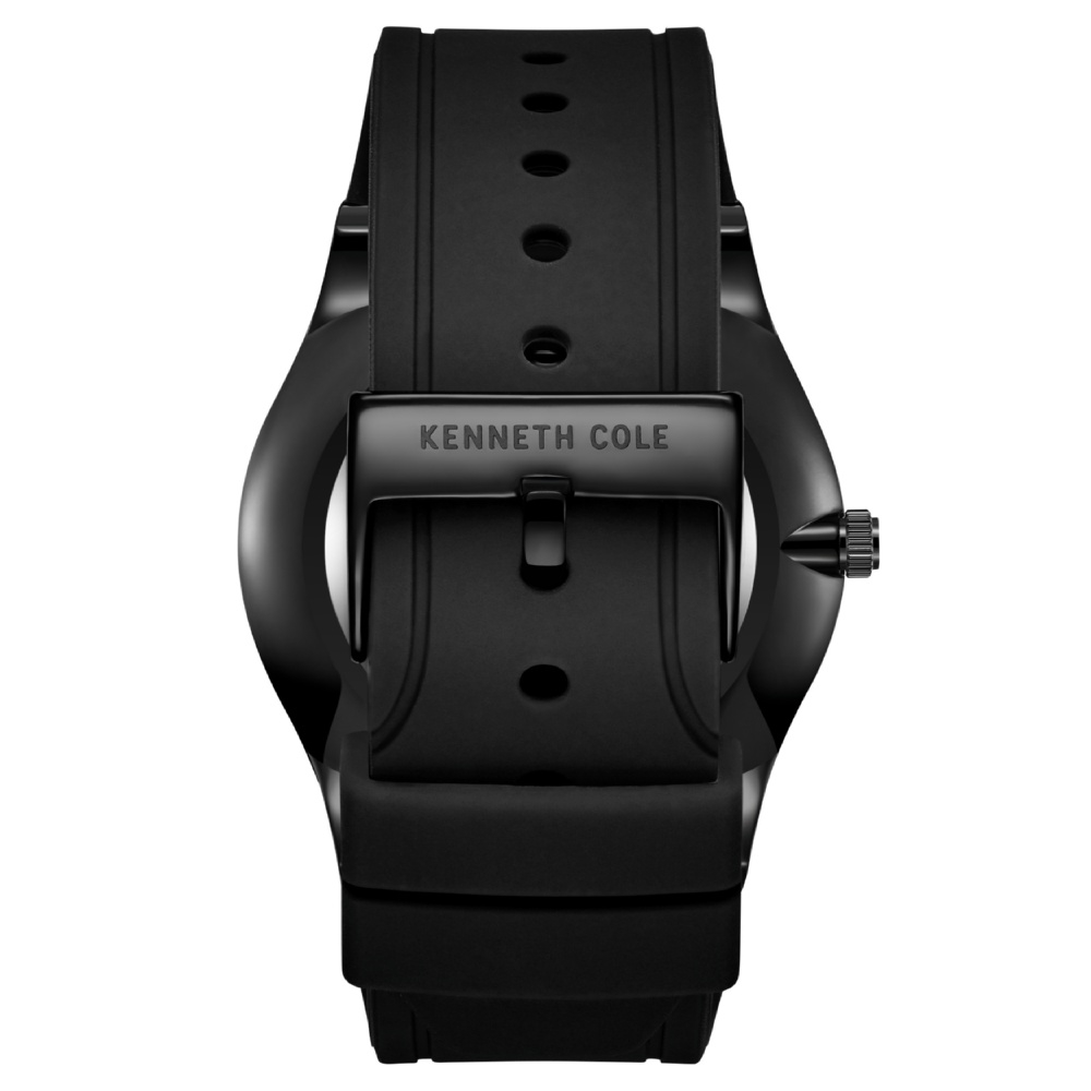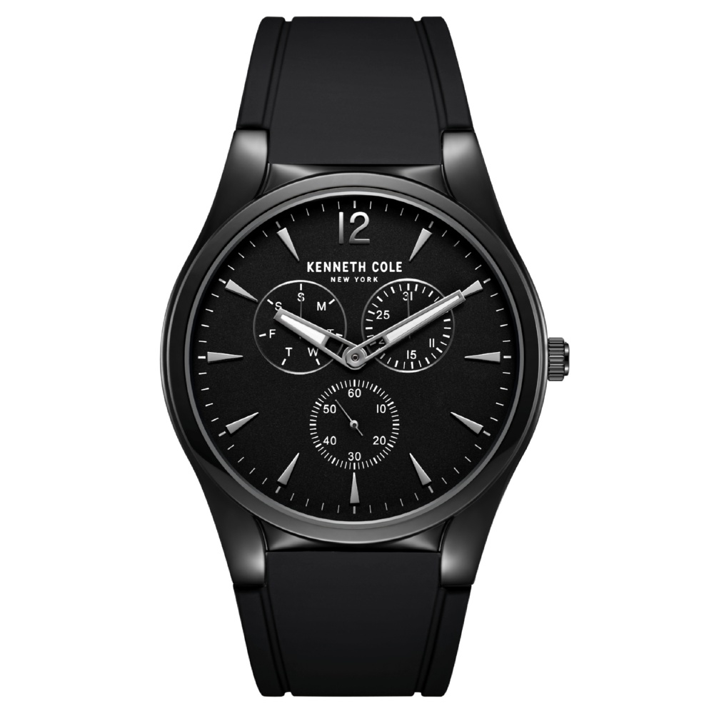 ساعت مچی مردانه کنت کول KENNETH COLE با طراحی کلاسیک بند سیلیکونی با قاب گرد مشکی و صفحه مشکی با قابلیت داشتن تقویم, روزهای هفته ,شب نما, زیرثانیه ,وموتور ژاپنی و انرژی باتری و مقاوم در برابر آب تا عمق 30 متر به همراه دو سال گارانتی بین المللی