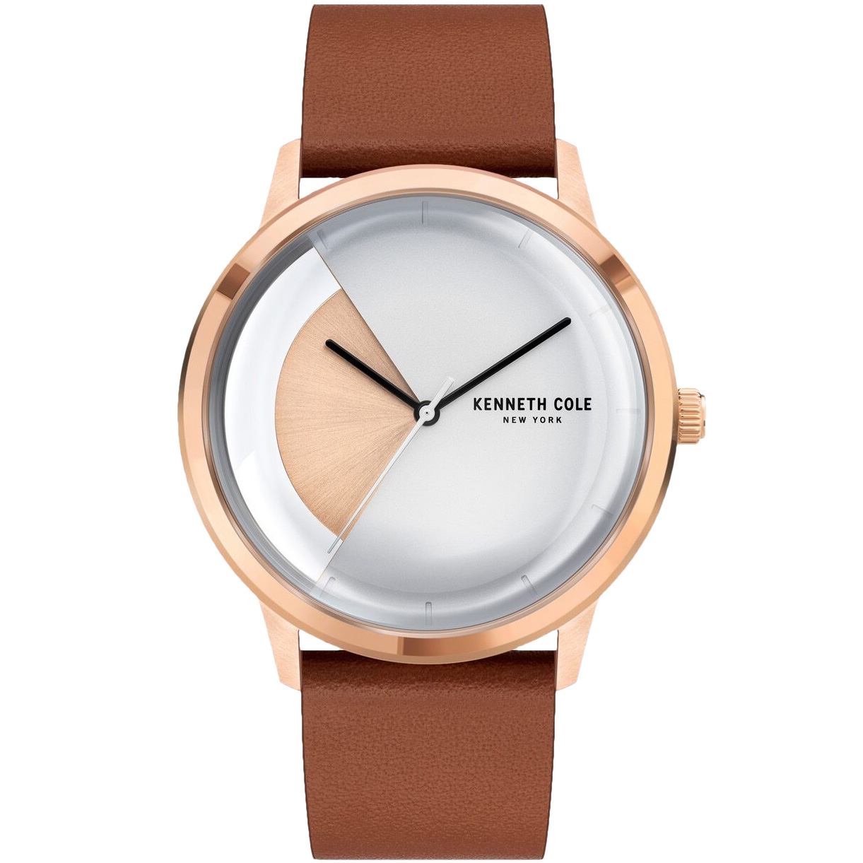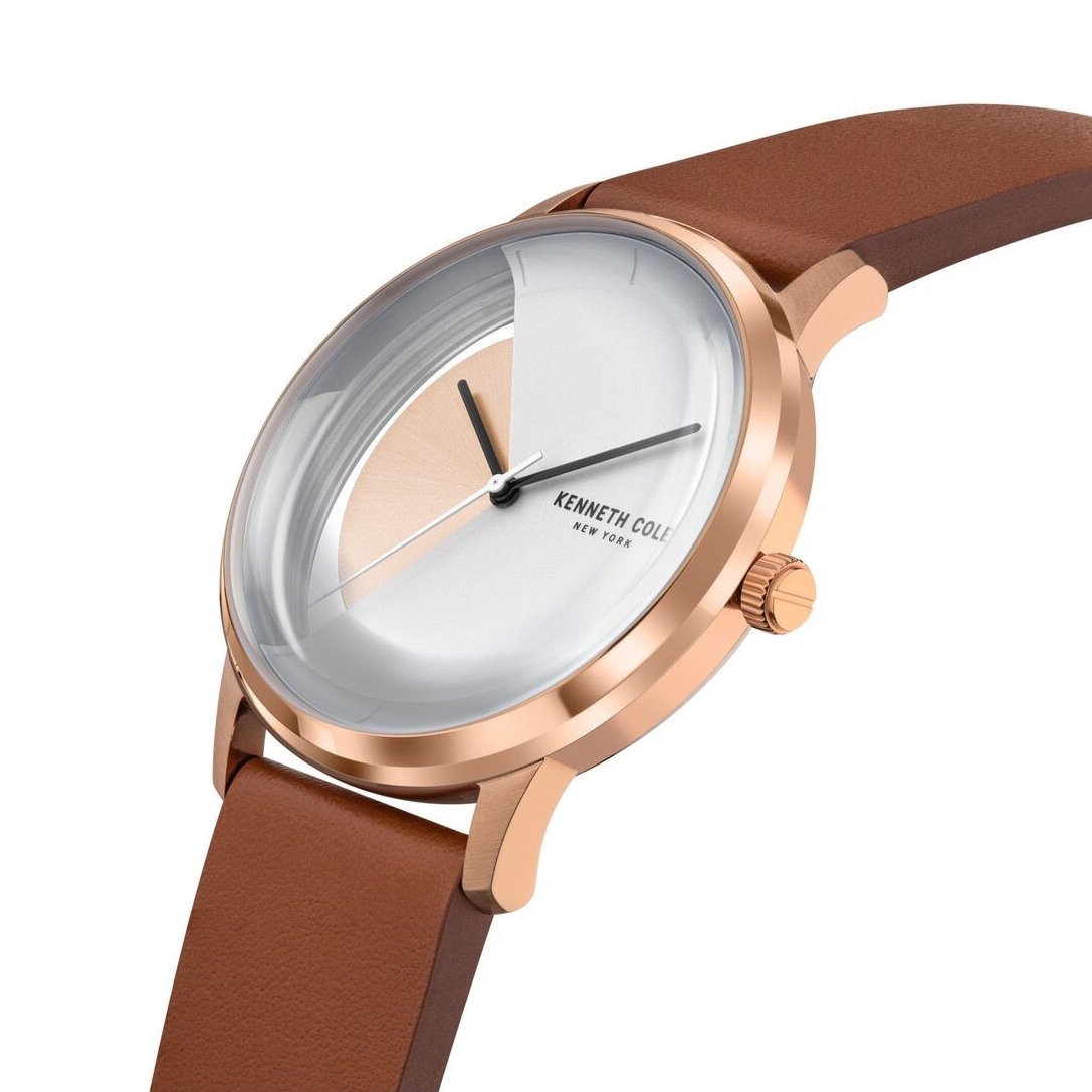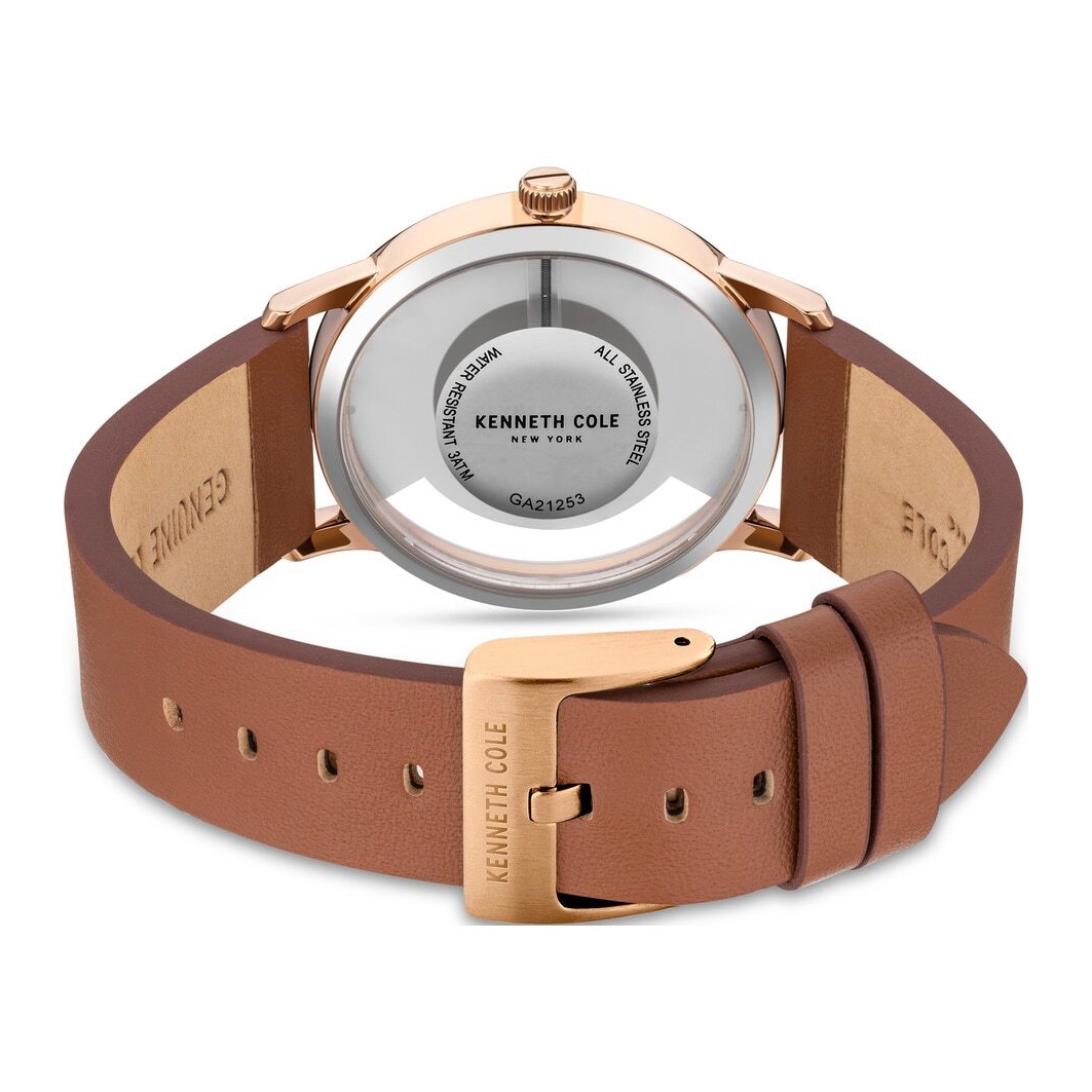 ساعت مچی مردانه کنت کول KENNETH COLE با طراحی کلاسیک بند چرم قهوه ای با قاب گرد مسی و صفحه نقره ای سفید مسی با موتور ژاپنی و انرژی باتری و مقاوم در برابر آب تا عمق 30 متر به همراه دو سال گارانتی بین المللی