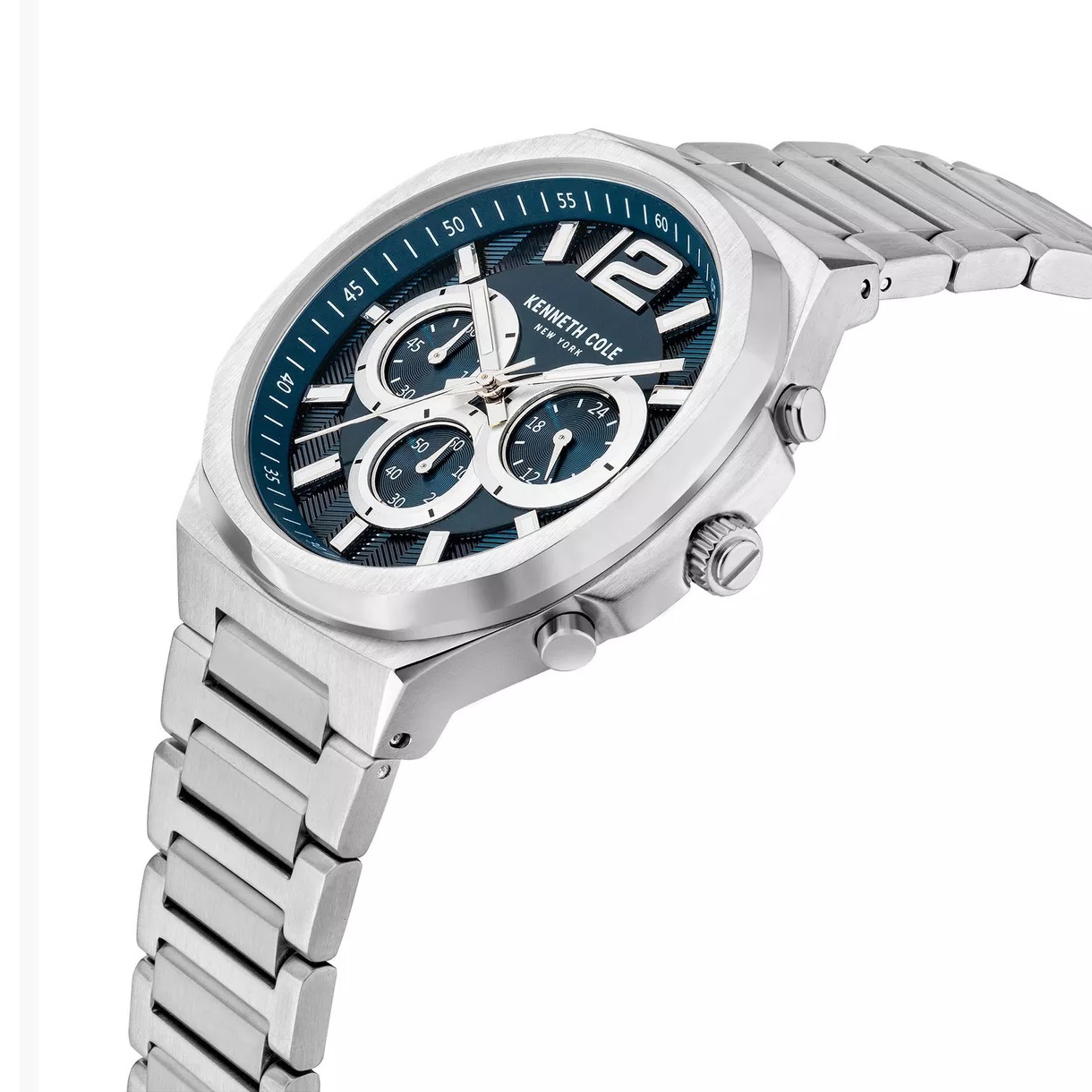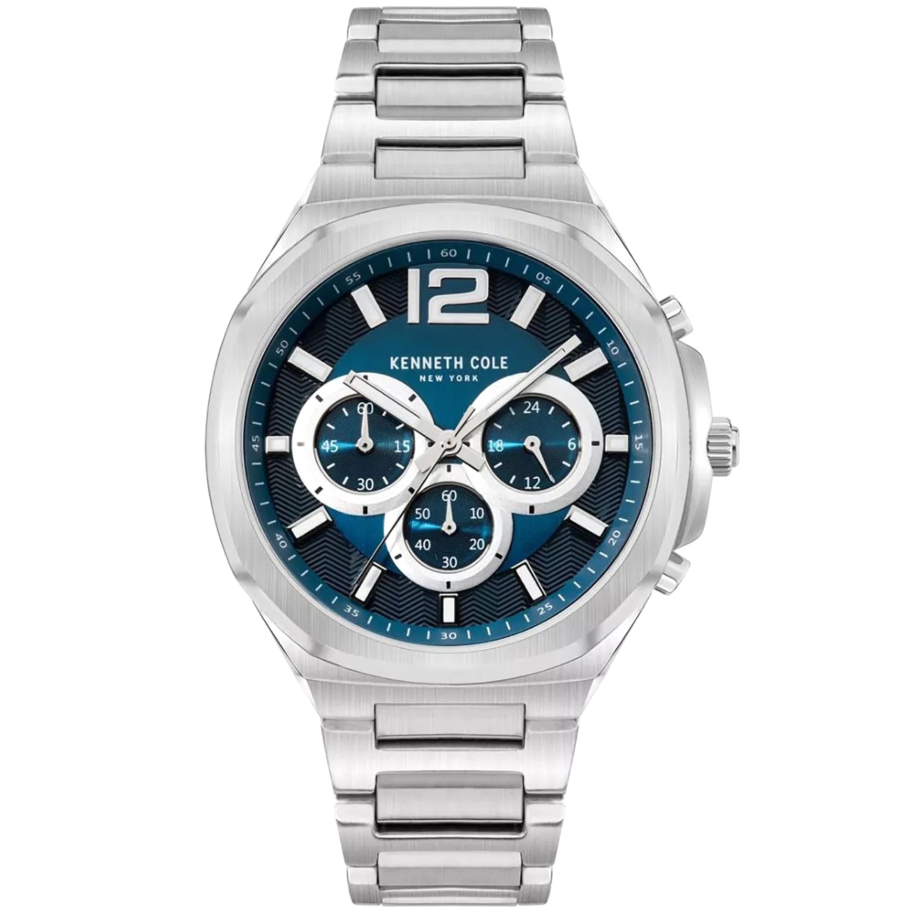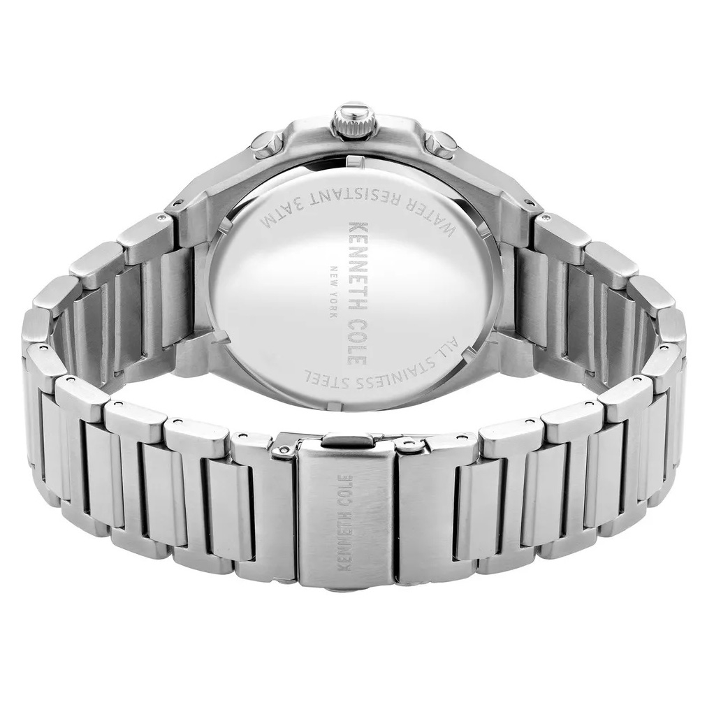 ساعت مچی مردانه کنت کول KENNETH COLE با طراحی اسپرت بند وقاب فلزی استیل وصفحه گرد ابی با قابلیت داشتن کرنوگراف, شب نما وموتورژاپنی با انرژی باتری و مقاوم در برابر آب تا عمق 30 متر به همراه دو سال گارانتی بین المللی