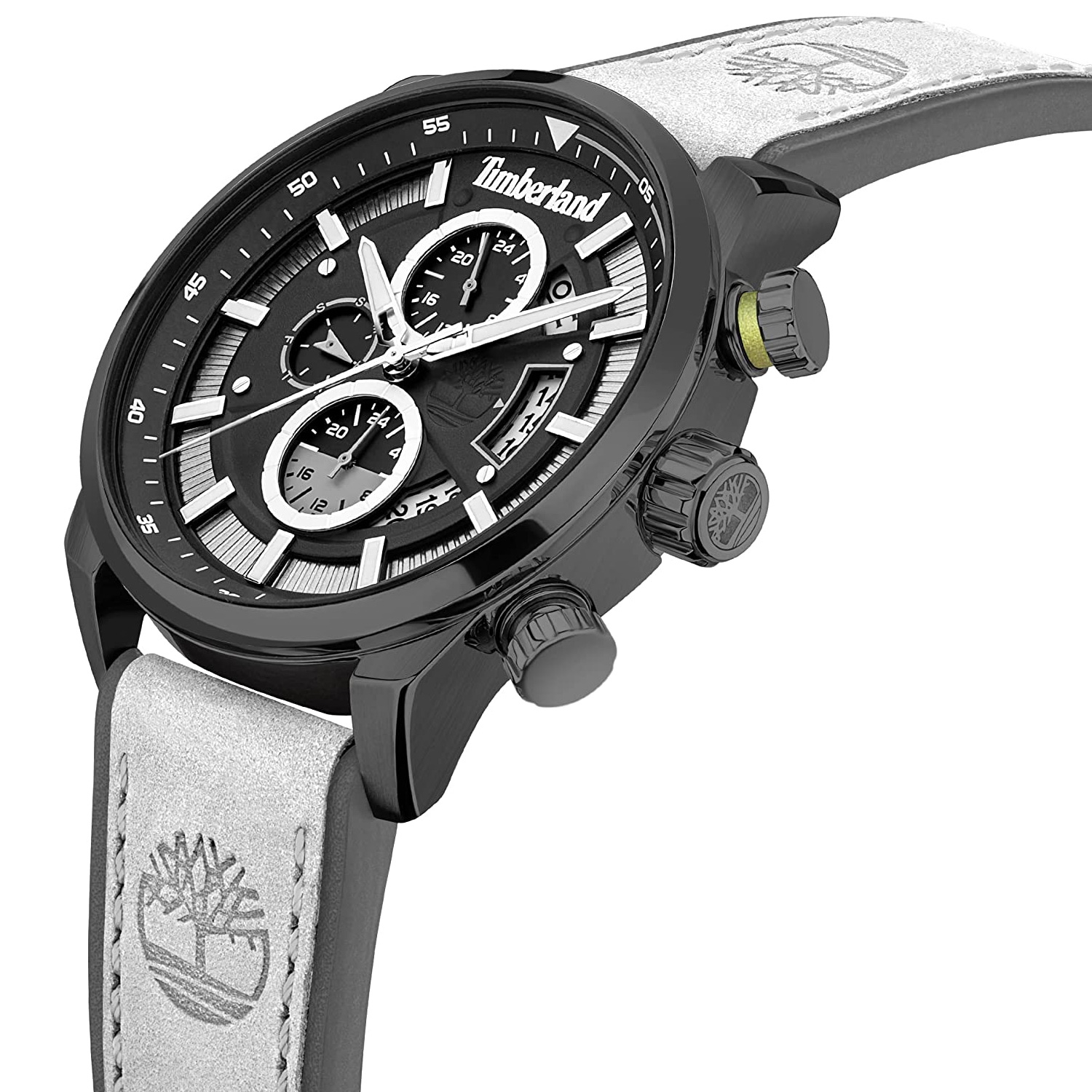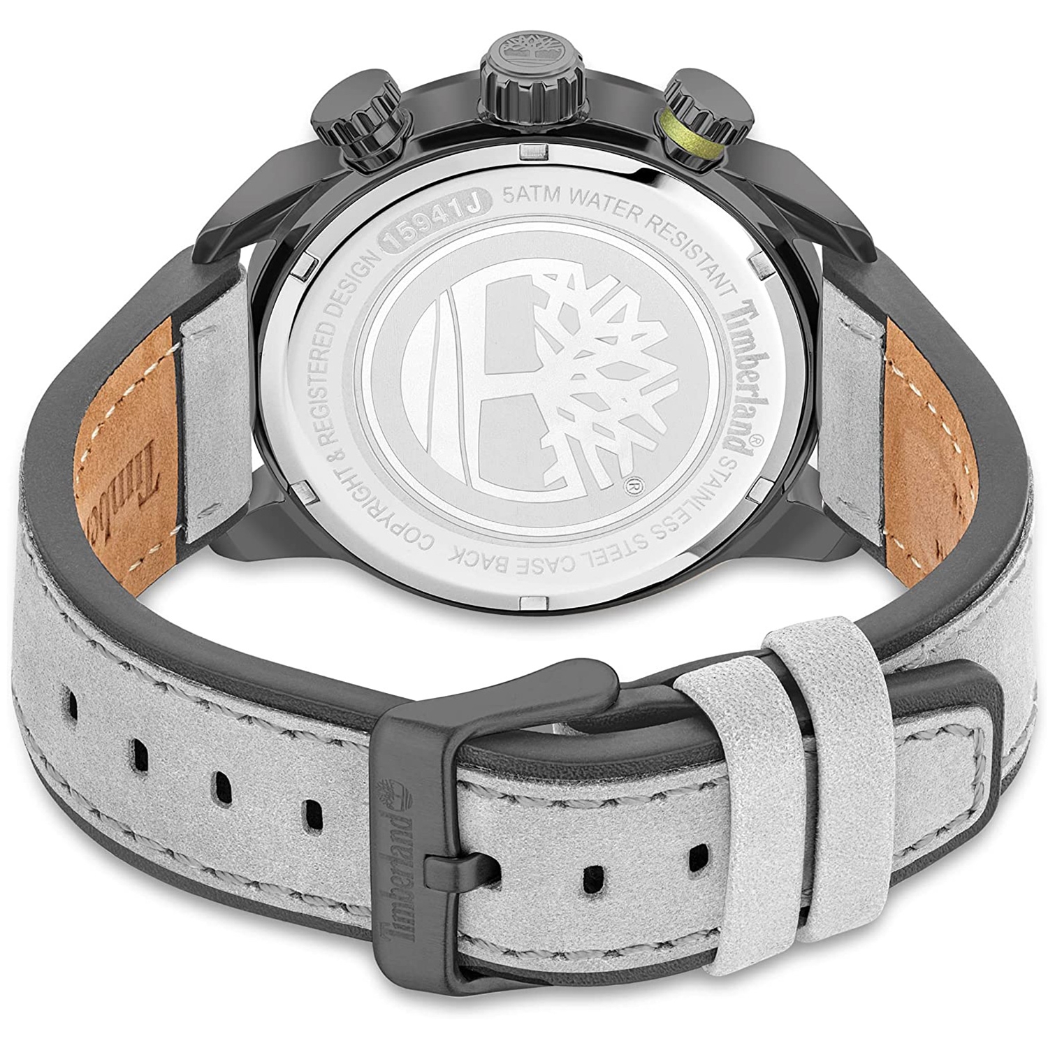 ساعت مچی مردانهTIMBERLAND با طراحی کلاسیک بند چرمی طوسی وقاب استیل وصفحه گرد مشکی طوسی با قابلیت داشتن کرنوگراف, تقویم , روزهای هفته, شب نما وموتورژاپنی و انرژی باتری ومقاومت دربابر اب تا عمق 50 متر با دوسال گارانتی بین المللی