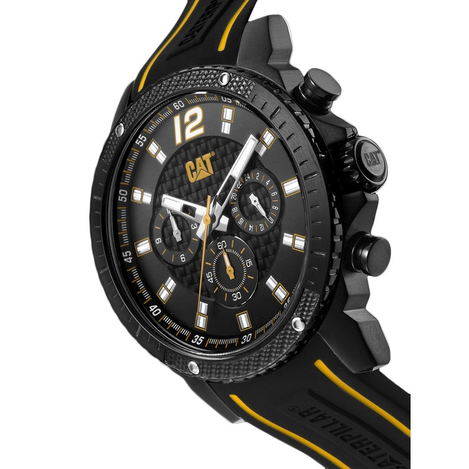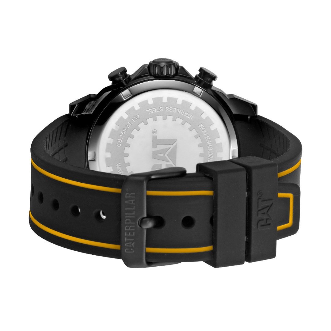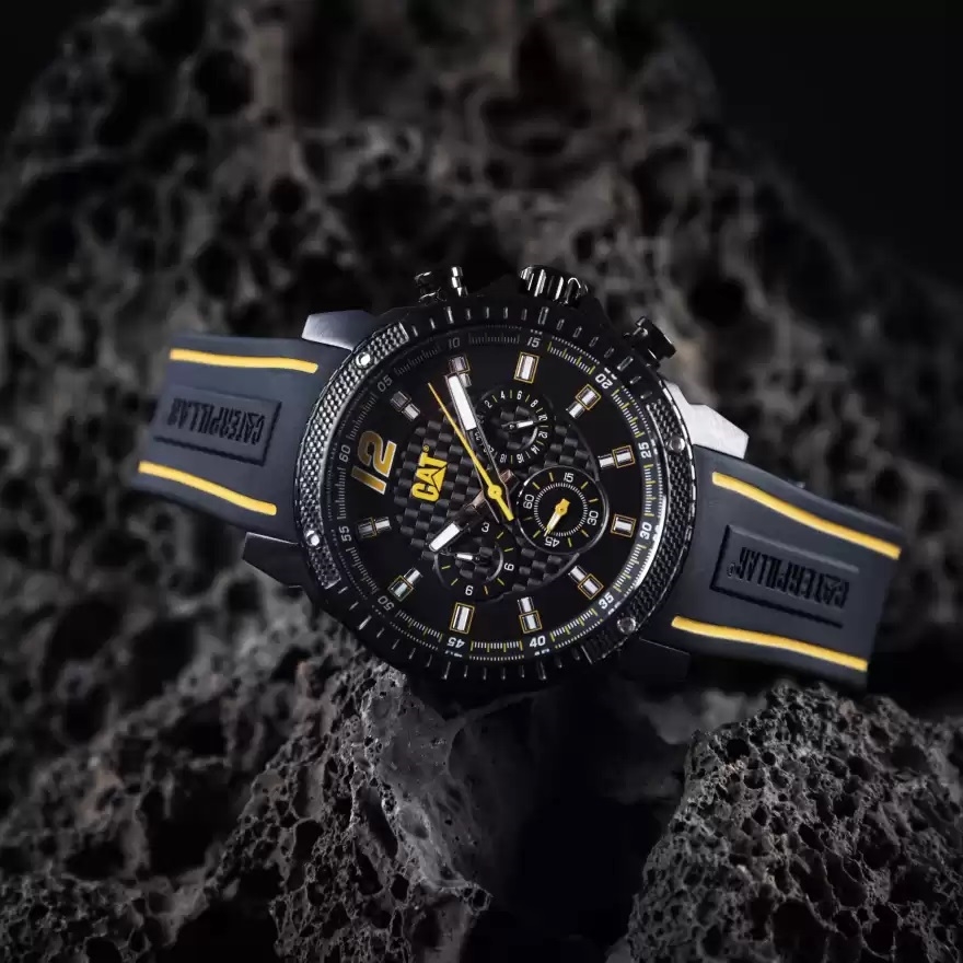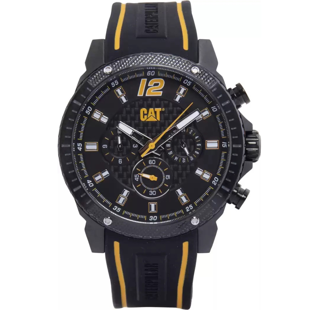 ساعت مچی مردانه Caterpillar با طراحی کلاسیک بند سیلیکون وقاب گرد استیل با صفحه گرد مشکی با قابلیت داشتن شب نما,کرنوگراف با موتور ژاپنی وانرژی باتری و مقاومت در برابر اب تاعمق 100 متربا 2 سال گارانتی بین المللی