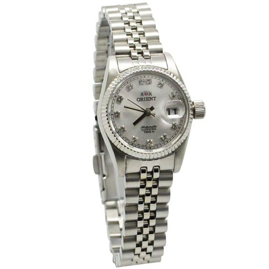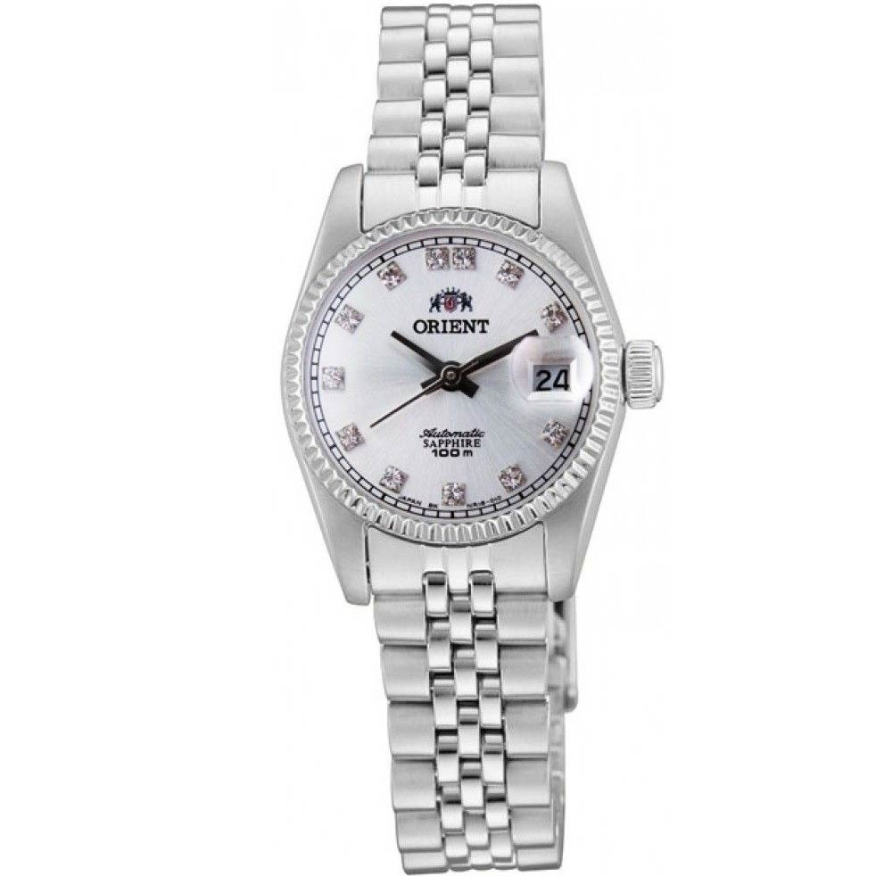 ساعت مچی زنانه اورینت ORIENT با طراحی کلاسیک بند وقاب استیل وصفحه کرد نقره ای مزین به نگین سواروفسکی وشیشه ضد خش با قابلیت داشتن تقویم وموتوراتوماتیک ژاپنی با انرژی مکانیکی ومقاومت در برابر اب تاعمق 100 متر به همراه دو سال گارانتی بین المللی