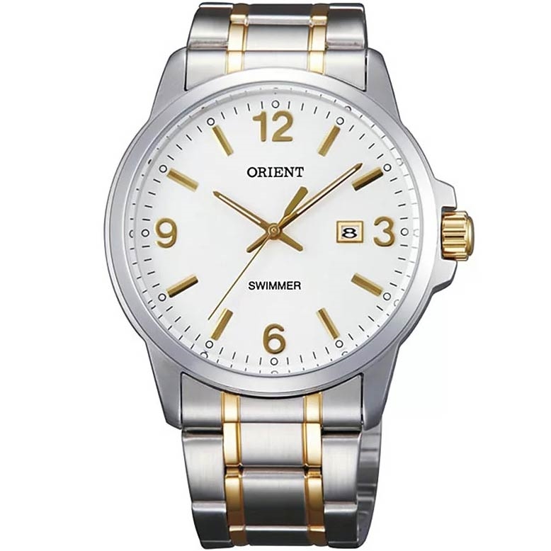 ساعت مچی مردانه اورینت ORIENT با طراحی کلاسیک بند استیل طلایی و قاب گرد استیل وصفحه سفید با نشانگرها واعداد با روکش طلایی با قابلیت داشتن تقویم و شب نما و موتور ژاپنی با انرژی باتری ومقاومت در برابراب تا عمق 100 متر به همراه دو سال گارانتی بین المللی