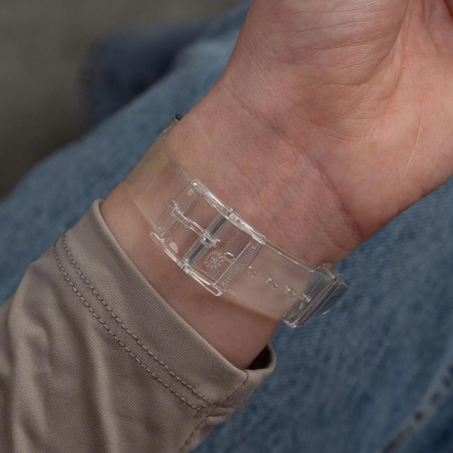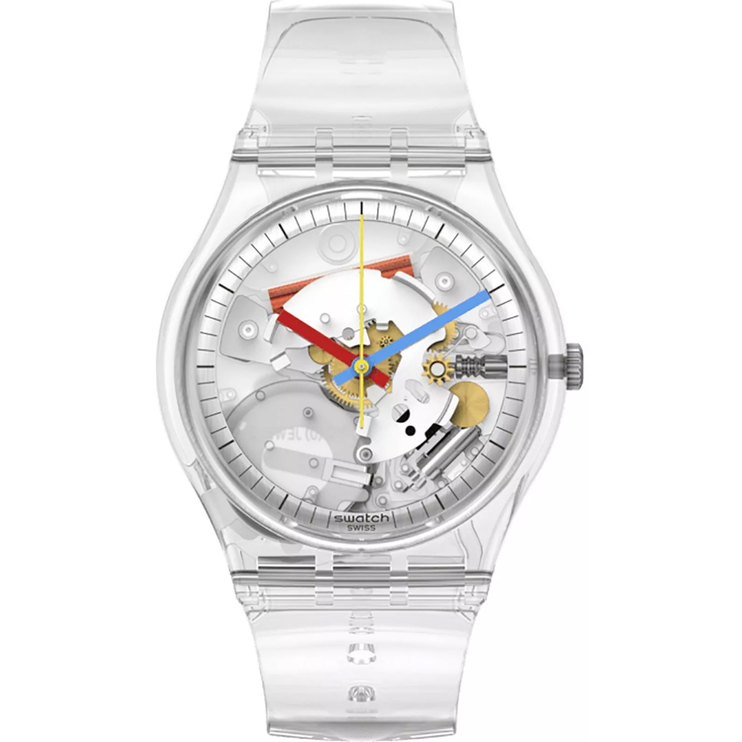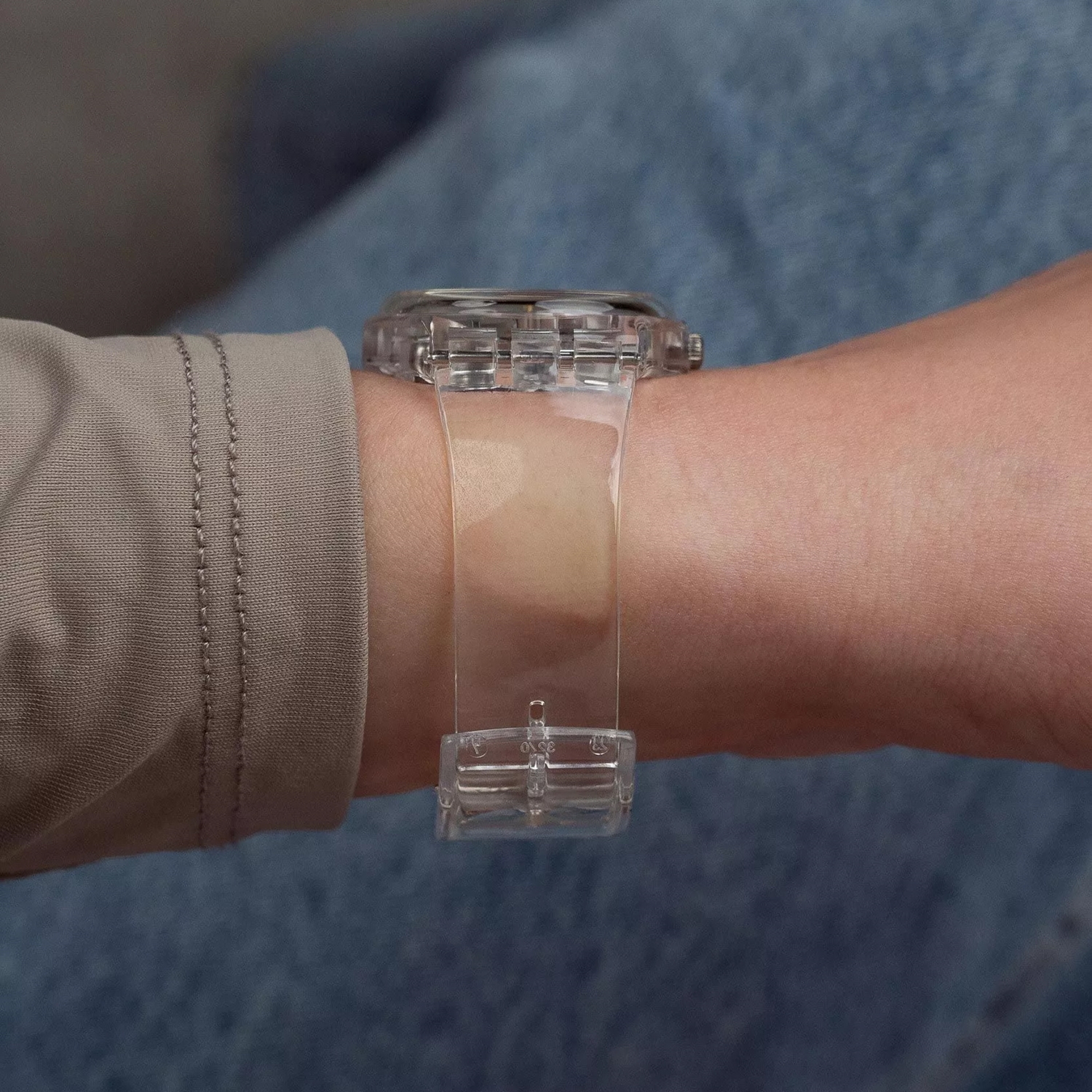 این ساعت سواچ با طراحی شفاف و مدرن، جلوهای چشمنواز دارد. حلقه نقرهای رنگ روی صفحه، عقربههای قرمز، آبی و زرد و نشانگرهای مشکی ترکیبی پویا و جذاب نشان میدهند. قاب شفاف براق از مواد زیست تخریب پذیر و بند شفاف دارد.