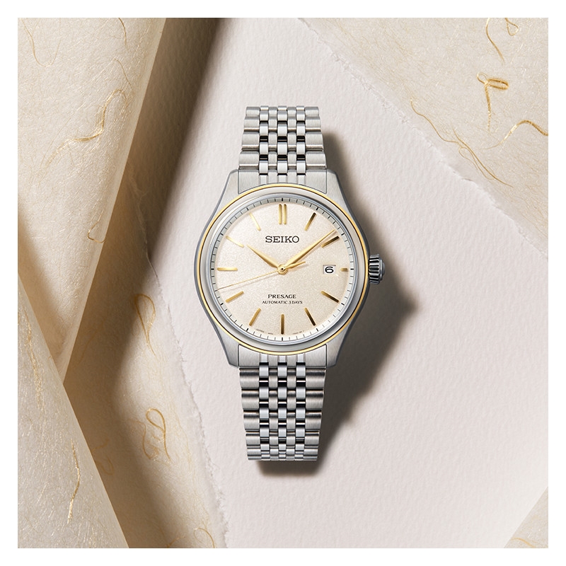 این مدل از ساعت سیکو از خانواده پرسیج با طراحی کلاسیک و ظاهری الهامگرفته از زیباییهای سنتی ژاپنی، انتخابی ممتاز برای آقایانی است که به جزئیات و کیفیت بالا اهمیت میدهند. صفحه کرم ملایم با الگوی بافتدار، به همراه عناصر طلایی در قاب، جلوهای لوکس و در عین حال متناسب با استفاده روزمره و رسمی ارائه میدهد.